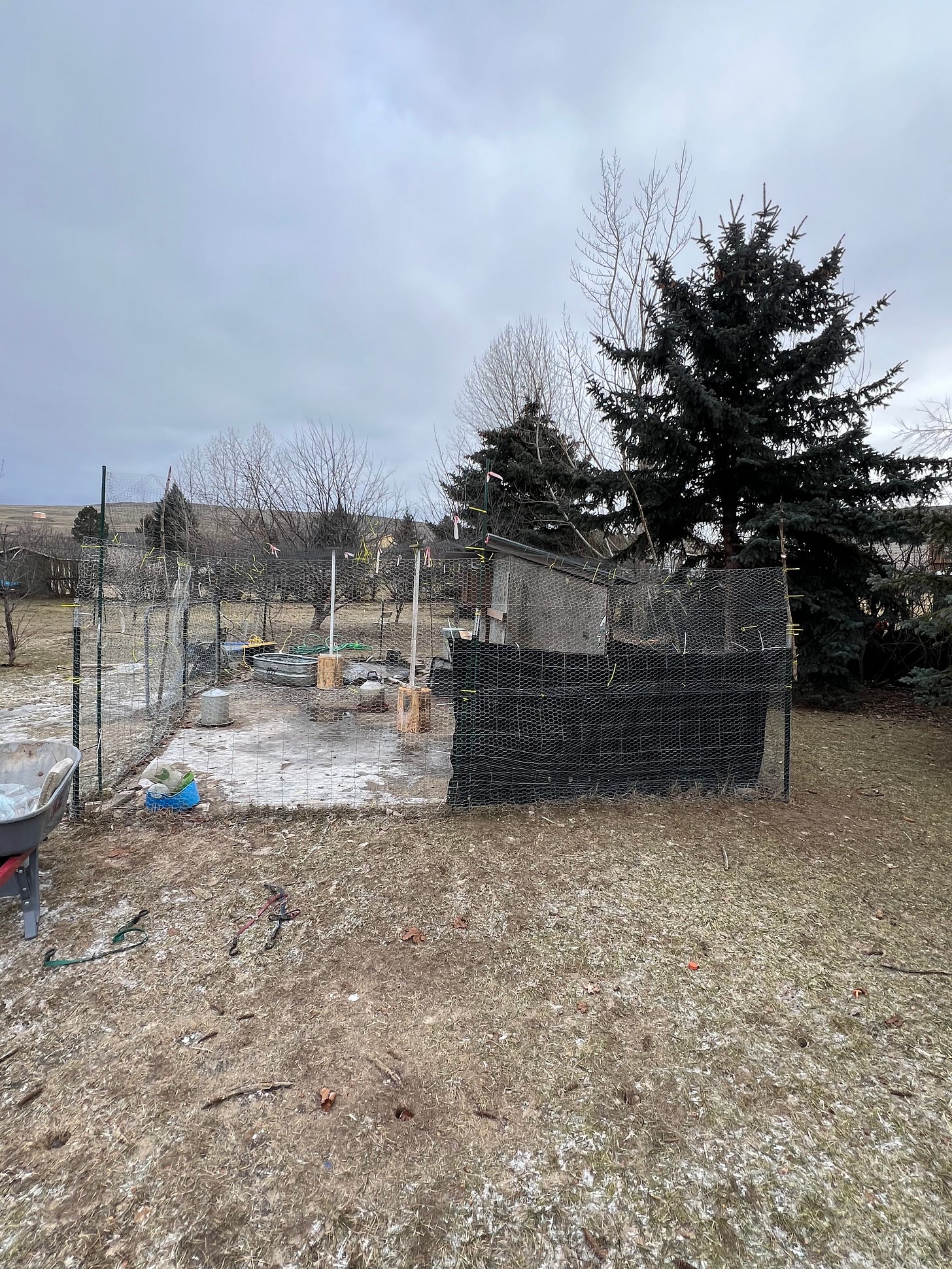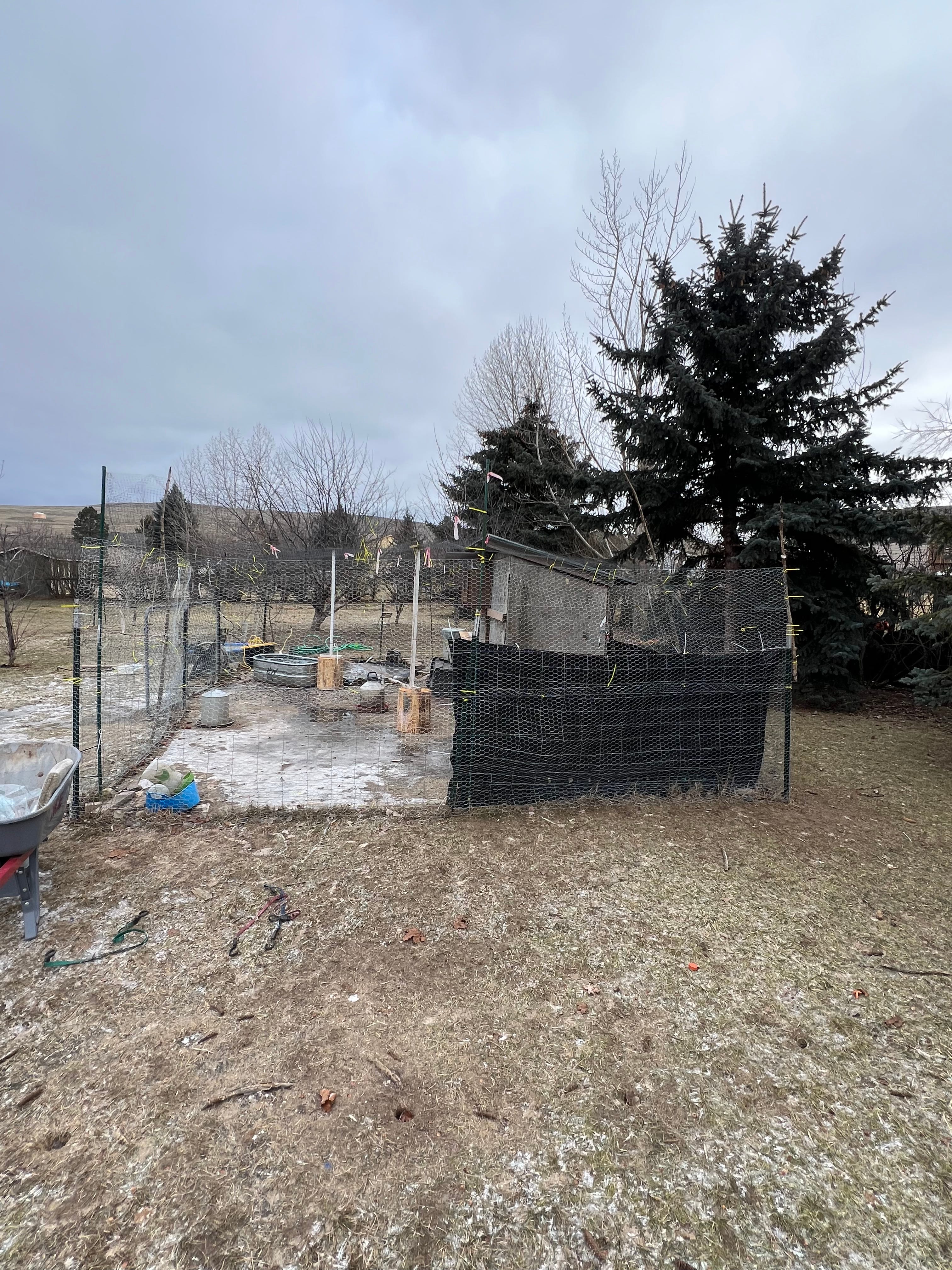 The next morning I took the kids to daycare and then drove to our local ranch store Murdochs. I bought chicken wire and bird netting and I came home and over the next 5 hours proceeded to build a fortress. I probably went a little overboard, but I put chicken wire all the way around 2 rows and then fully covered the top of the enclosure with bird netting and connected it to the chicken wire all the way around. My hands were raw and bleeding doing the work in the dry cold air by myself. PS — if you have to do anything with chicken wire… have 2 people, it’s a pain the ass to mange by yourself. It’s definitely not pretty, it’s not as tight as it could be, and the ground is frozen so I haven’t staked it in all the way around yet. But.. it’s been almost a week now, and I still have 1 male duck and 3 female ducks. I still have all my chickens. I moved the ducks water into the enclosure — in the winter they had had a stock tank under our porch where it was easier to fill without worrying about freezing hoses. But now they’re staying in their fortress for the meantime. We’ll see when I let them roam again. There’s still plenty of roaming chickens in our neighborhood.. hopefully whatever predator found our yard will move on and never come back. That was a rough week. 8 ducks lost.