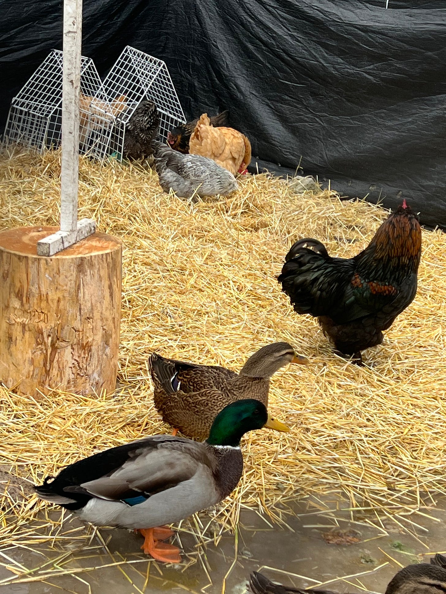 I went back to my yard and felt that something was off. My ducks were clumped super tight and on first glance it looked like there were fewer of them than there should be. At this point I had 12 ducks, 3 males and 9 females. I started walking my backyard and my heart absolutely dropped. I saw not one, not two, but 3 piles across my backyard. Walking to them I saw they were in pristine condition… minus heads. My first flush of emotion was to call up my neighbor and be like “your damn dog killed my ducks - my dogs have been in the yard with them for years with no issues, and now they’re dead” but I checked that and touched base with my husband. He pointed out very reasonably that if they’d been killed by dog they’d be damaged — it was probably an owl or maybe a mink. The ducks were all frosty also, they’d been down most of the night. Eventually I did find a 4th dead duck - one of my males, I think he’d been stunned or maybe had his neck broken by the owl and he had been played with by the dogs unfortunately. I don’t think any of the dogs killed the duck, but the opportunity to play with a dead duck was definitely too sweet of a chance to pass up. I think that’s probably what pulled Max over into our yard, I did also find that the fence was structurally unsound and he probably just walked over.. didn’t even need to jump. So I’m glad he was there so it showed me I needed to reinforce the fence. That day I did a temporary fix on the fence - tying it up to some trees so it’s at least upright. I was down to 8 ducks, 2 males and 6 females. My ratio was intact, but numbers depleted.