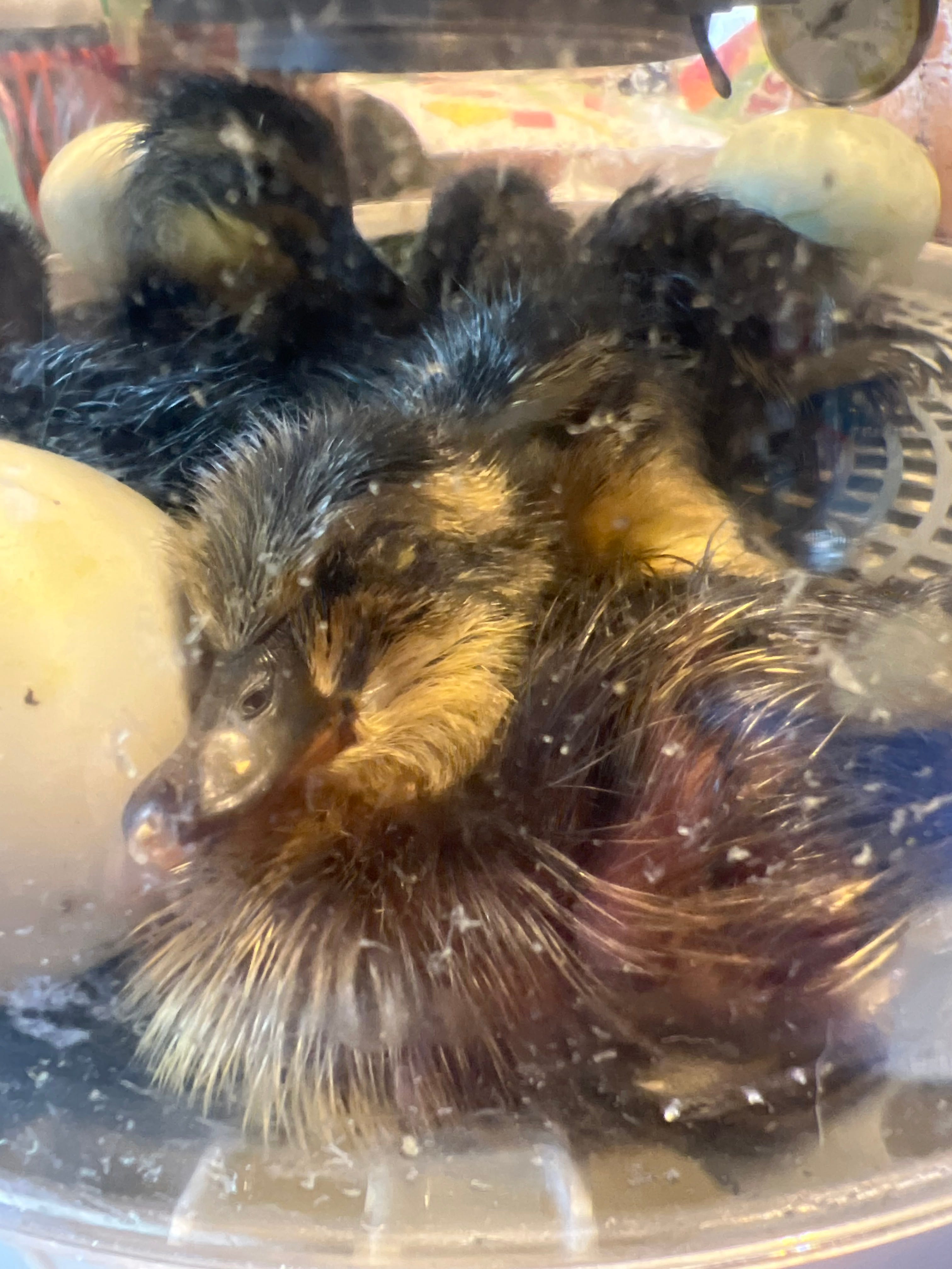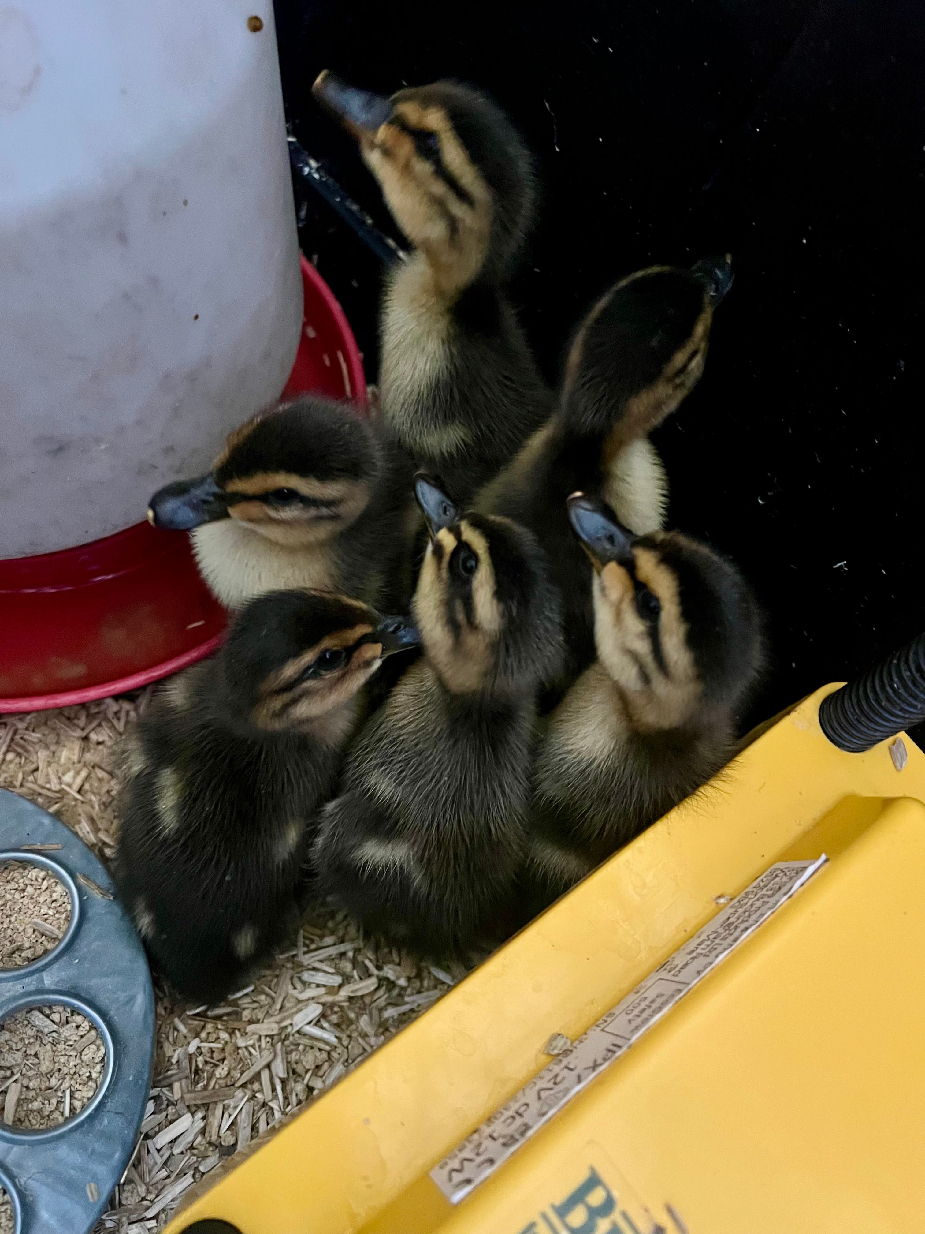 We moved the ducklings from the incubator into their new home - one of the durable black tote storage containers with a Brinsea brooder, water and flock raiser duckling food. We kept the ducklings in the incubator for several hours until they had started to dry out and fluff out a little bit. I did quickly open the incubator a couple times to remove some of the shells to make more room for the ducklings, 5-10 of them in there is quite the pile. Ducks are still nourished by the egg yolk and don’t need to eat for 12ish hours after being born, pretty incredible that a duck lays an egg EVERY DAY with this much potential. Our ducks clustered under the brooder for the first day and by the next morning they had all found the food and water all by themselves and were happily eating and making a mess. Nature is incredible. I’m so thankful to be a part of this process.